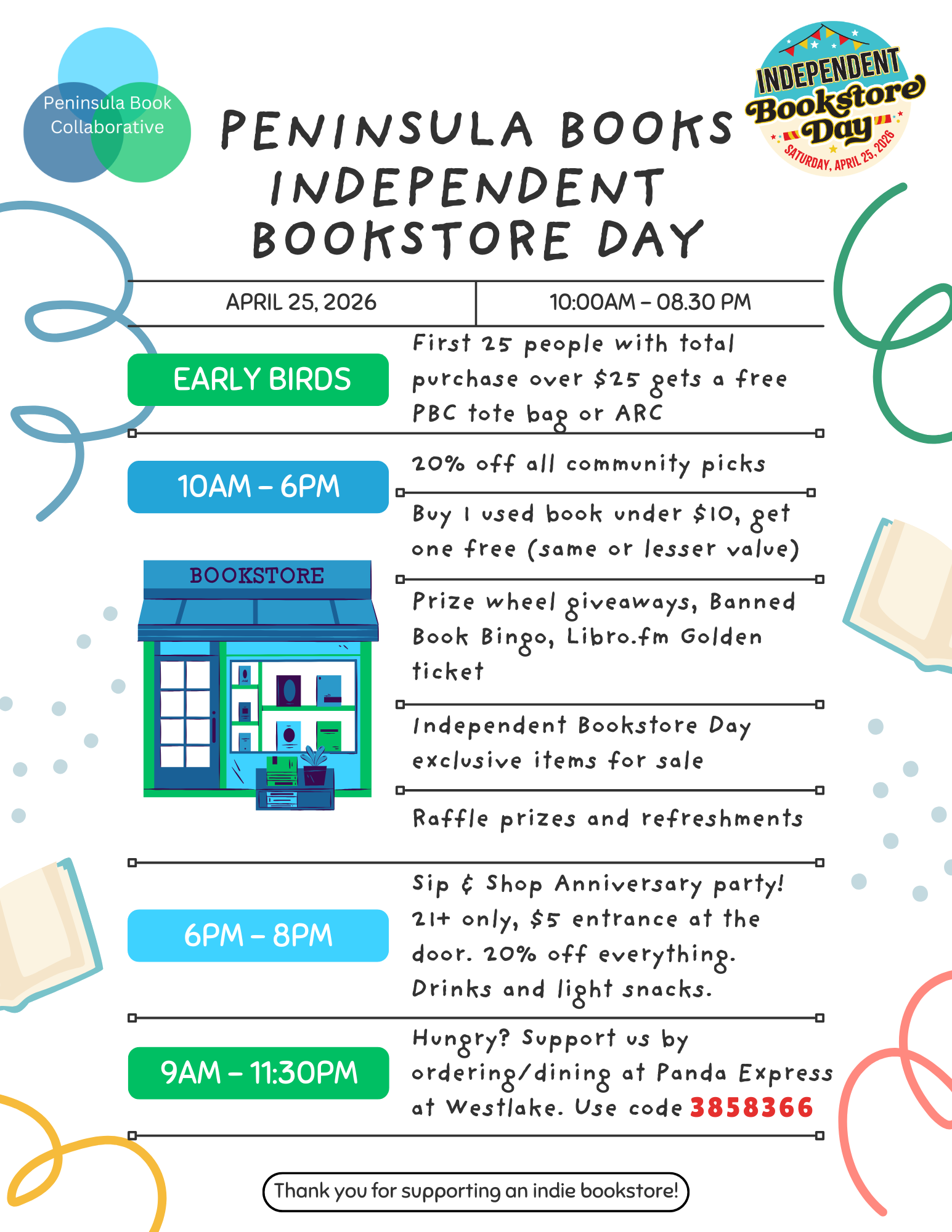 Independent Bookstore highlights Indies across the country that are uplifting the community. Join us in the celebration and also for our birthday party at 6 pm. 10am-12 pm: First 25 people with total purchase over $25 gets a free PBC tote bag or ARC 10-am-6 pm: 20% off all community picks Buy 1 used book […]