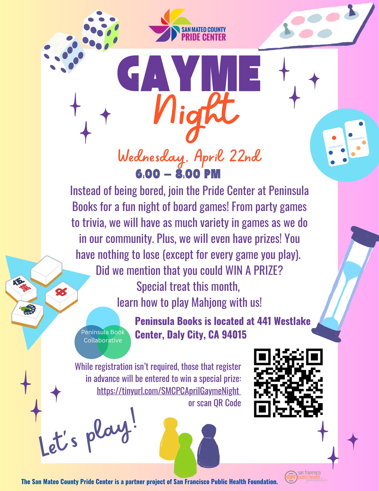 San Mateo County Pride Center Gayme Night at Peninsula Books - a free community event! Wednesday, April 22 from 6:00-8:00PM at 441 Westlake Center, Daly City 94015 Game on! We hope you can join us for another game night at Peninsula Books in Daly City. As a special treat this month, we’ll be teaching Mahjong! […]