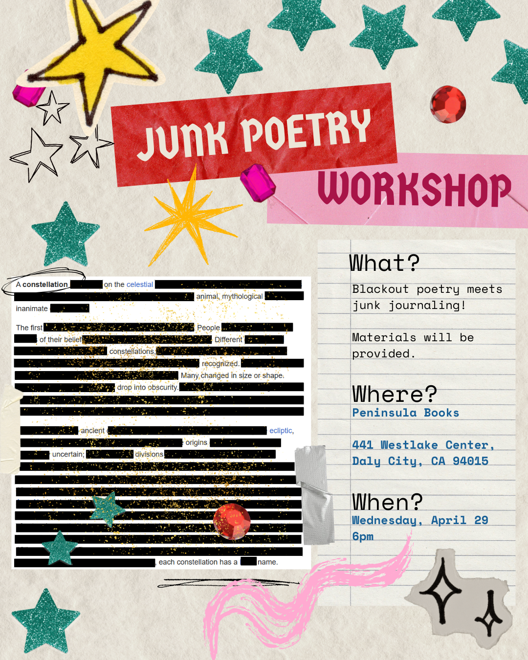 Join us! Blackout poetry meets junk journaling! Materials will be provided. Presenter: Dina Klarisse