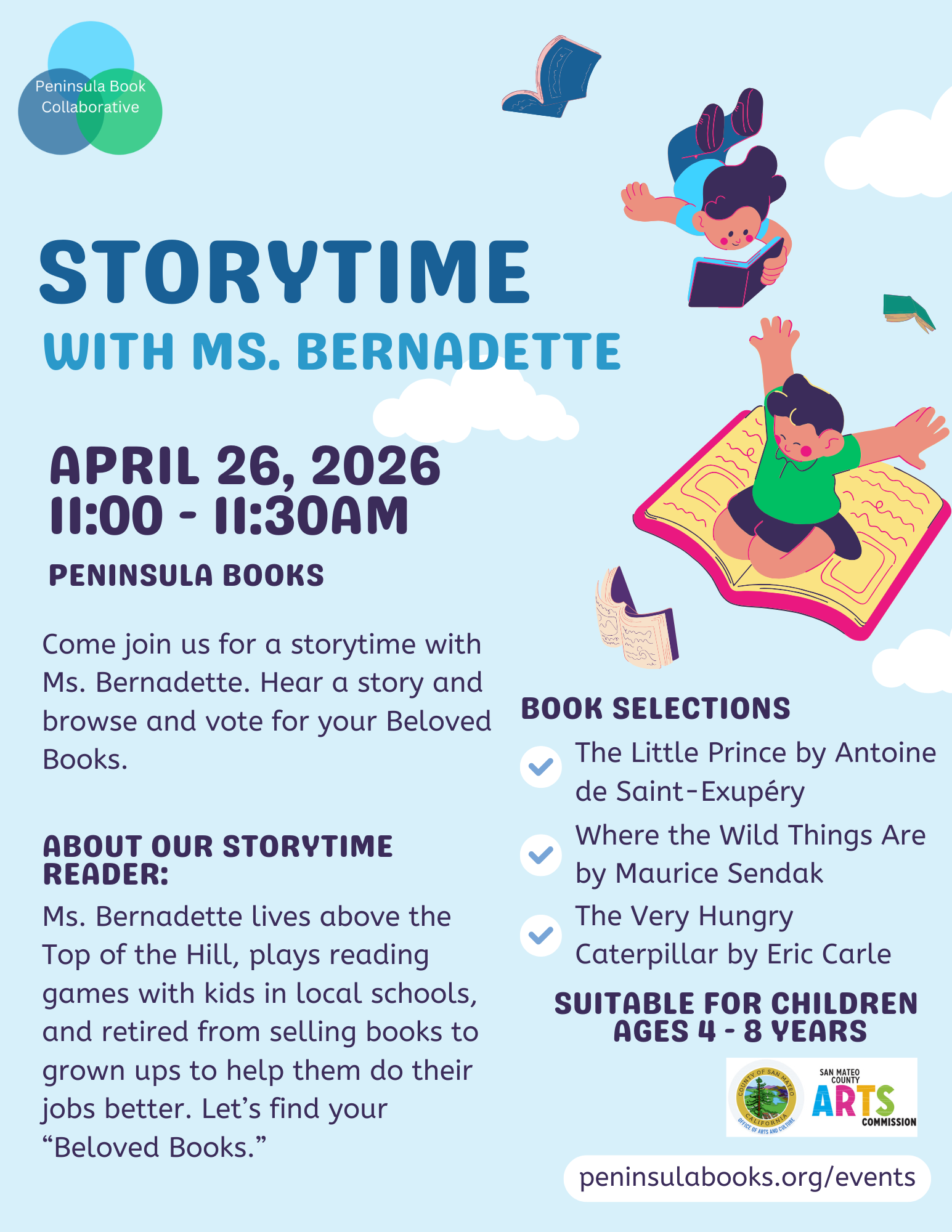 Come join us for a storytime with Ms. Bernadette. Hear a story and browse and vote for your Beloved Books. Book Selections The Little Prince by Antoine de Saint-Exupéry Where the Wild Things Are by Maurice Sendak The Very Hungry Caterpillar by Eric Carle About our StoryTime Reader: Ms. Bernadette lives above the Top of […]