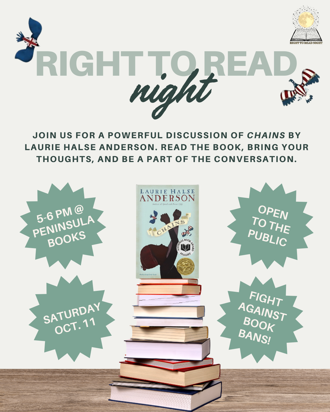 Join us for a powerful discussion of Chains by Laurie Halse Anderson. Read the book, bring your thoughts, and be a part of the conversation.