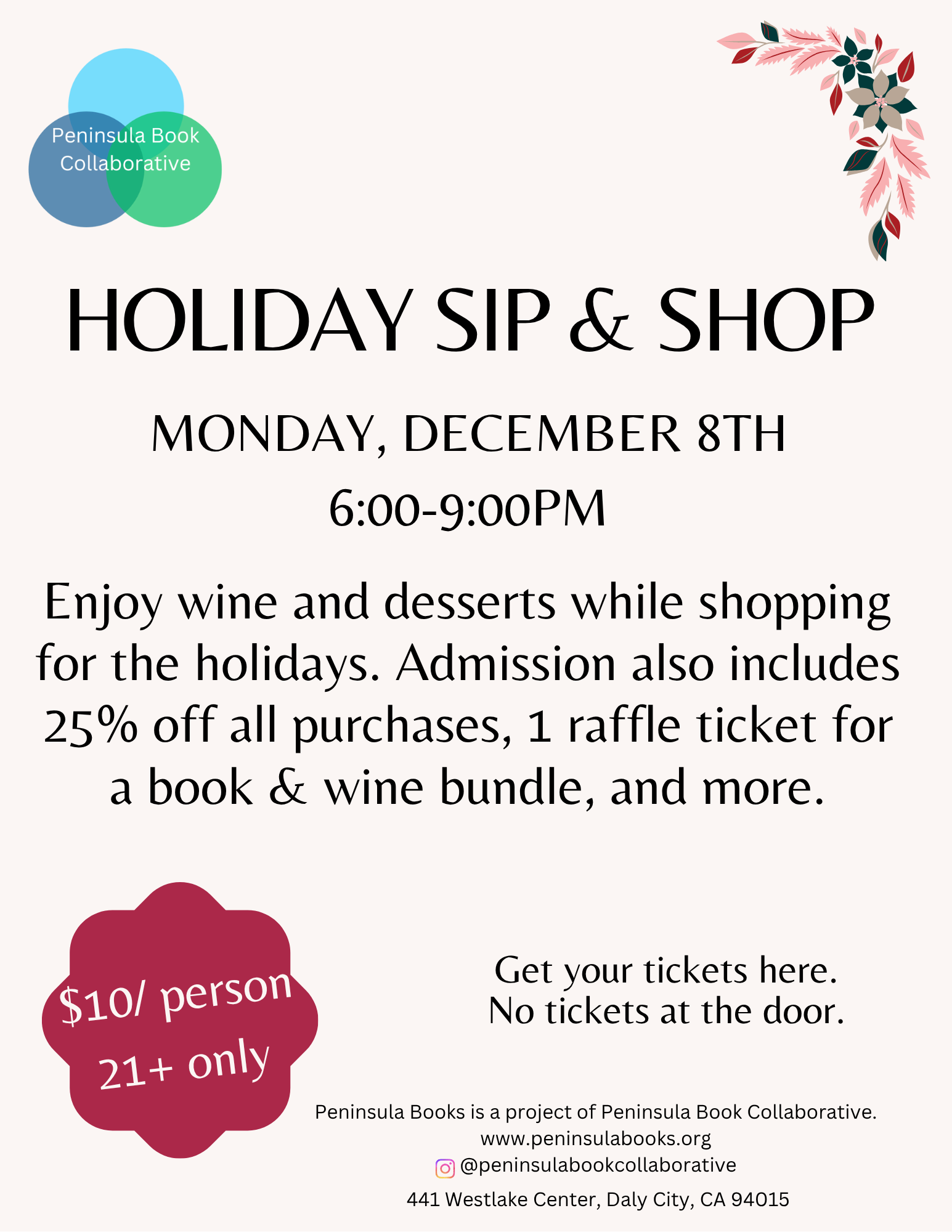 Join us for a night to celebrate books and community while raising funds for Peninsula Book Collaborative. We will have silent auction items, raffle prizes and more. Your ticket includes food, drinks, and fun! Proceeds from the event will support free programs and author events for the community.